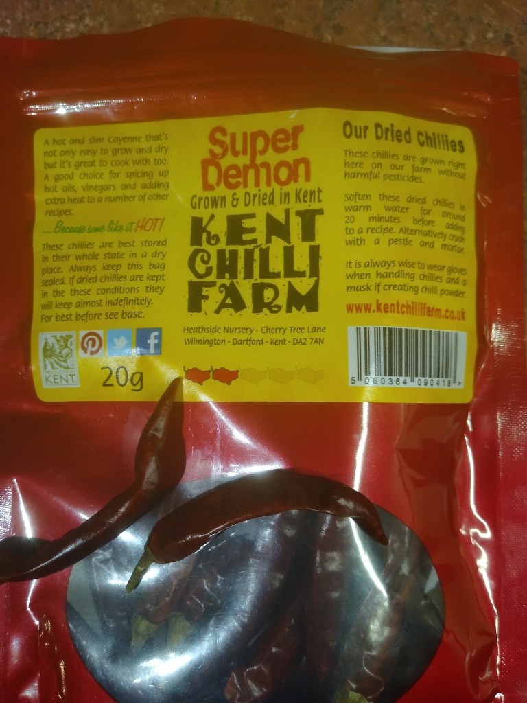 Just in case you weren’t aware, most of the heat from chillies is in the seeds so if you want it milder, leave the seeds out. I get the dried chillies from the Kent Chilli Farm. They do a wide range of chilli varieties. These were Super Demon.