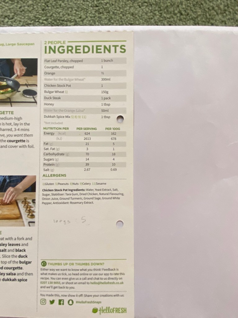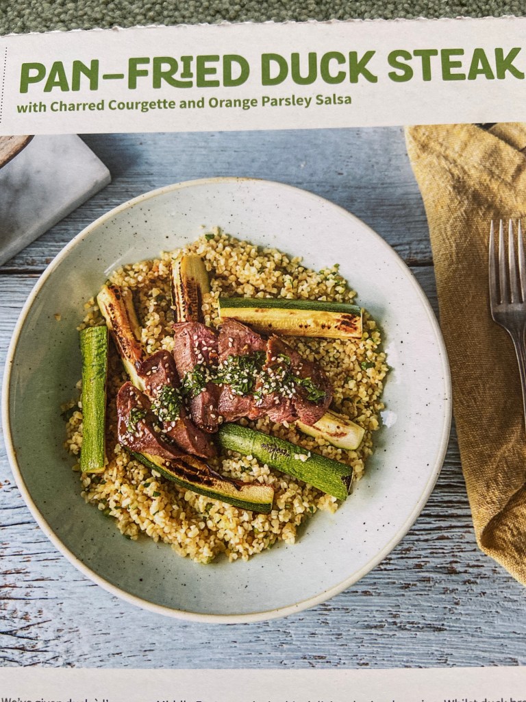 This is a recipe I got from Hello Fresh. Rather tasty. Ingredients Flat leaf parsley – 1 bunch Courgette chopped ,orange half, water for the Bulgar Wheat 300ml ,Chicken stock pot 1, Duck steak depending on size 1 or 2. Honey 1 tbsp water for the Orange salsa 50ml Dukkah Spice mix 1tbsp.