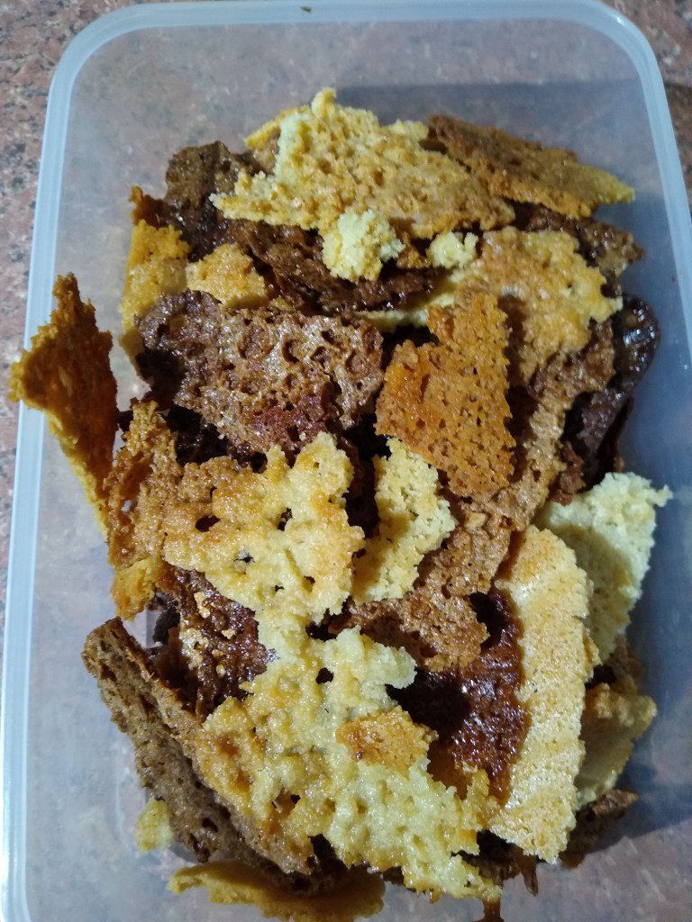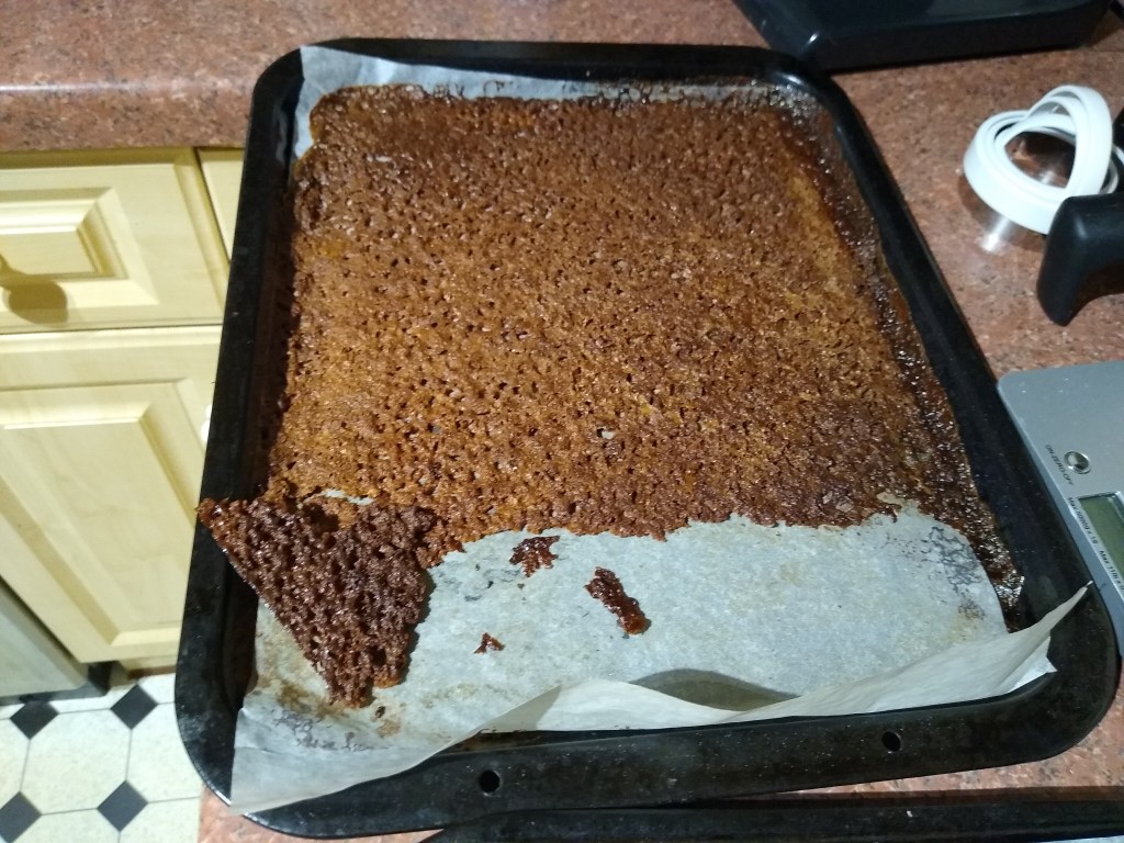 One was a little more done than the other but a few minutes later, it was cool enough to handle. It is more like a brandy snap than anything else. Tastes great though so i’ve cracked it into pieces and we’re munching through it. Every cloud….