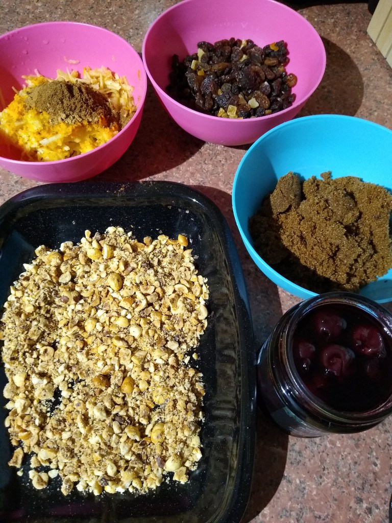 Chopping the nuts could’ve been very messy. Instead, I put them into a clean food waste bag (so I could reuse it later, no plastic waste) and bashed them with a ladle.