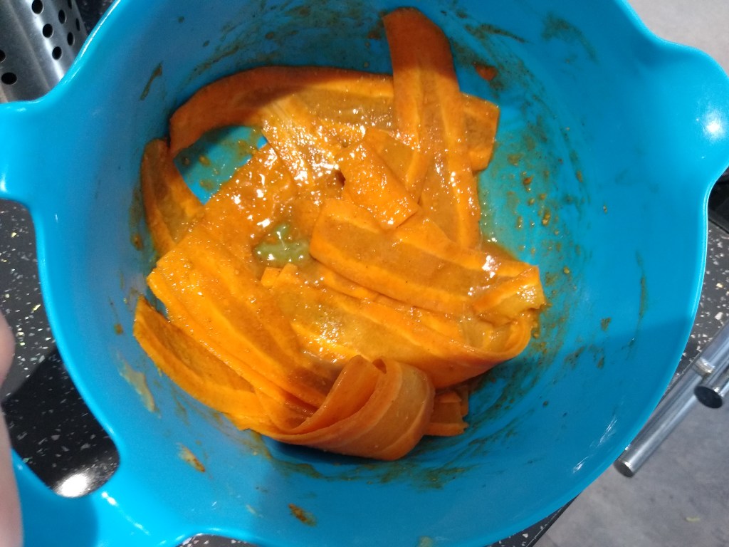 - No put the carrot slices in the bowl and coat well. Leave to marinate for 5 mins or so.