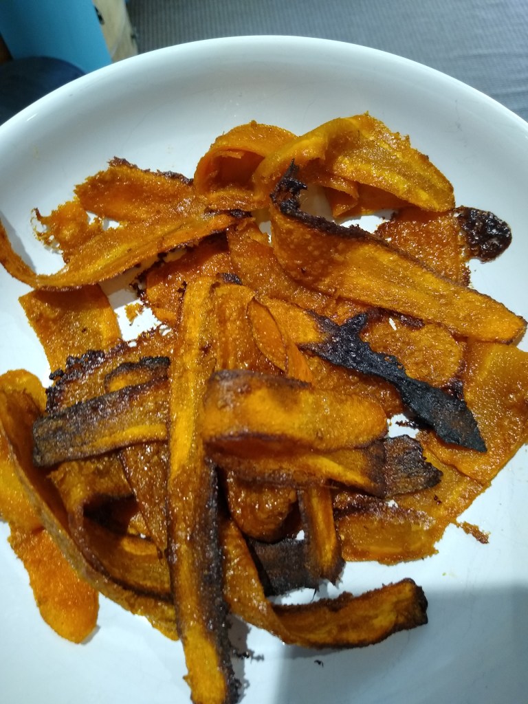 - Remove from the oven and using the flat of a knife take the carrot off the tray and onto a plate to cool. At this point it will be floppy but it will crisp up as it cools.