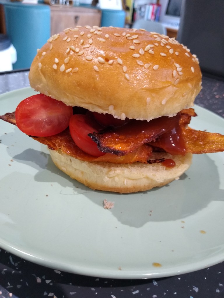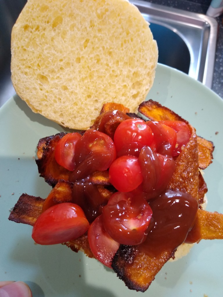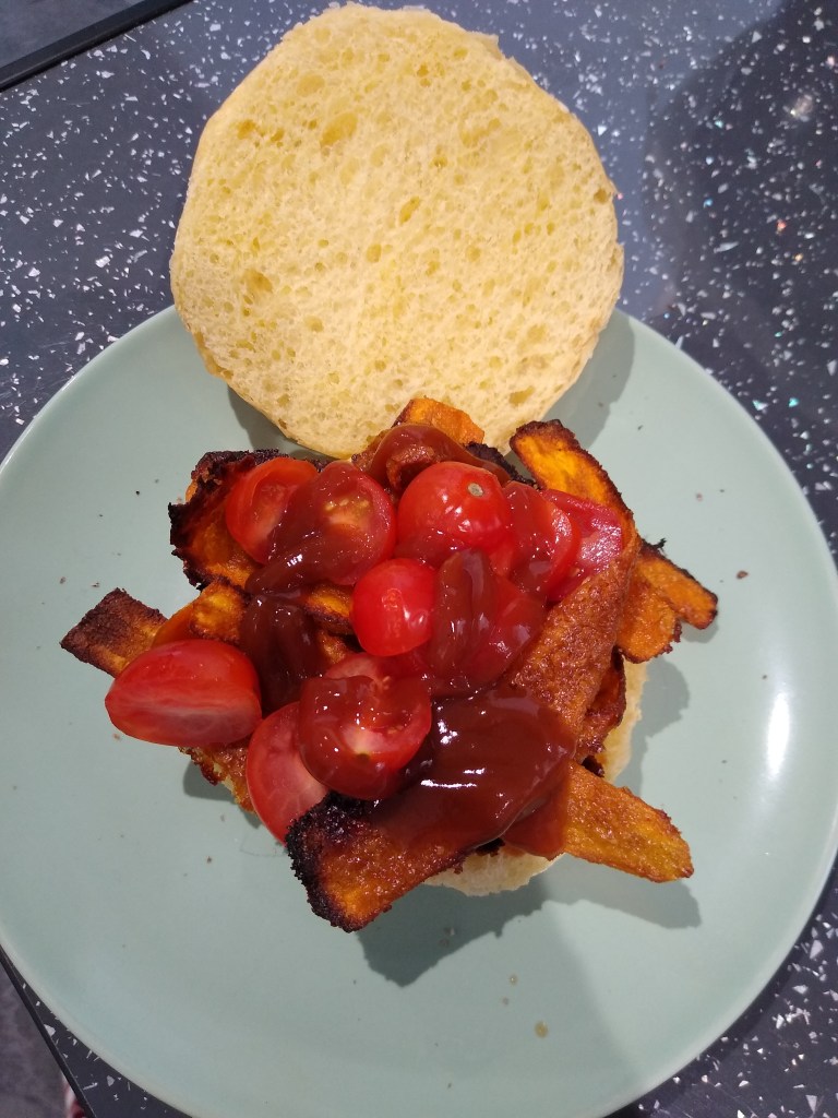 - That’s it, munch away. I’ve shown it here with a vegan brioche bun (Aldi), some chopped baby plum tomatoes and a splash of brown sauce.